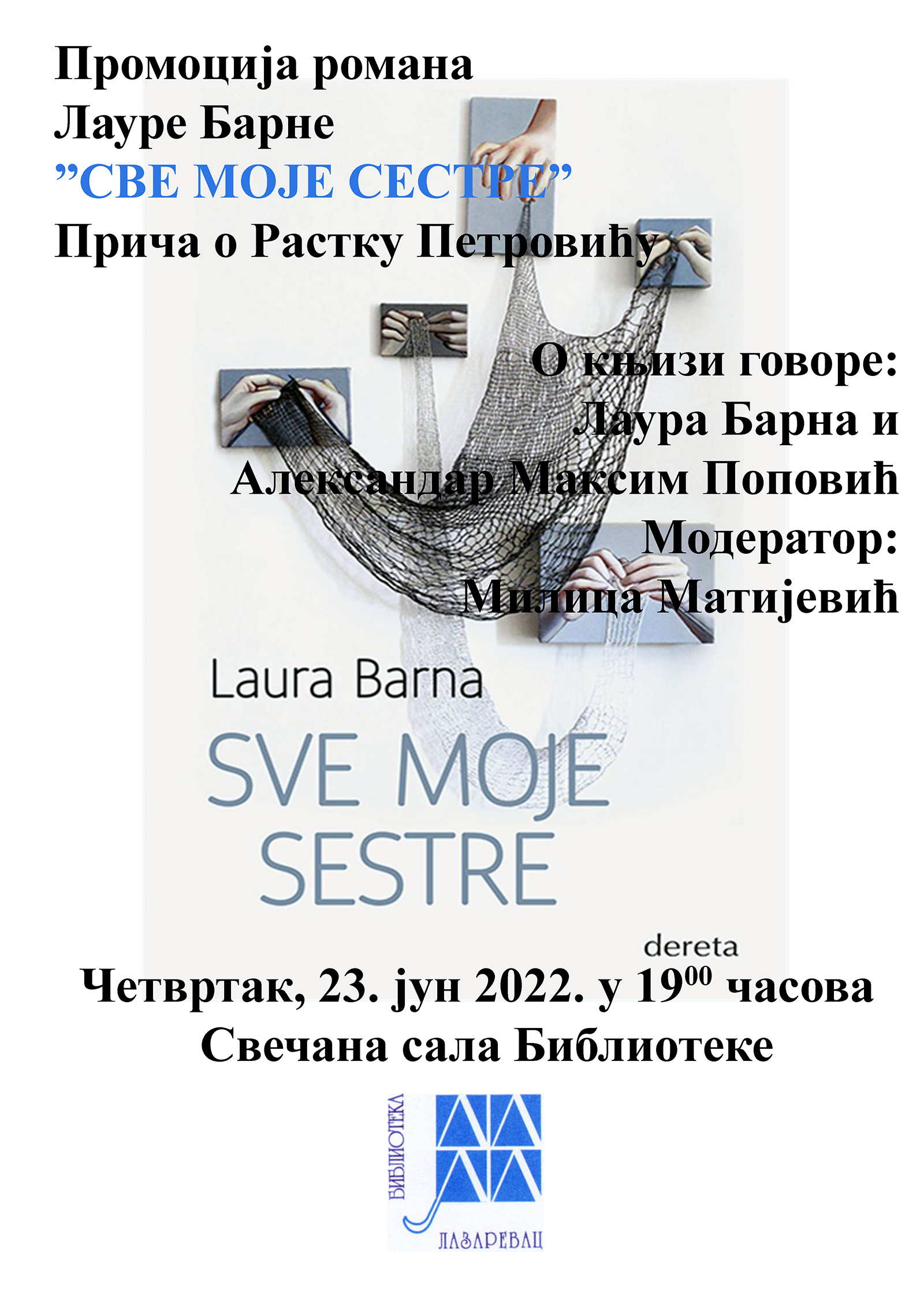 Промоција романа „Небо је било плаво а сунце жуто“ Душка Лесендрића![]() У понедељак, 27. јуна у свечаној сали Библиотеке „Димитрије Туцовић“ одржана је промоција романа „Небо је било плаво а сунце жуто“ Душка Лесендрића. Роман је објављен у издању Библиотеке и прву промоцију имао је у оквиру манифестација Дани Степојевца почетком јуна док је синоћна промоција одржана у оквиру манифестације Дани Лазаревца. Дани Степојевца![]() Манифестација „Дани Степојевца“ одржана је у ОШ „Вук Стефановић Караџић“ у Степојевцу од 9. до 11. јуна ове године. Библиотека „Димитрије Туцовић“ учествовала је са неколико програма почевши од реализације изложбе „Степојевац – прича некад и сад“ до објављивања и промоције књига Душка Лесендрића „Небо је било плаво а сунце жуто“ и Љиљане Влаховић „Има те у свакој стопи“. Промоција књиге „Писма једној стени“![]() „Писма једној стени“ наслов је исповедне прозе у епистоларној форми завичајног аутора Ненада Радојичића. Књига је промовисана у оквиру манифестације Дани Лазаревца. Поред аутора о књизи је говорила директорка Јасмина Иванковић, а одломке читао глумац Првог приградског позоришта Александар Трмчић. Прича и Растку Петровићу![]() |