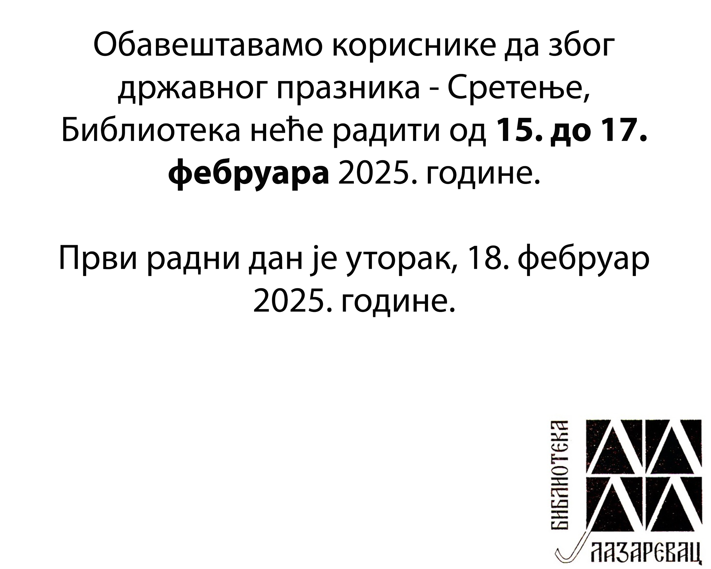 НАГРАЂЕНИ НАЈТАЛЕНТОВАНИЈИ УЧЕСНИЦИ КОНКУРСА „УСКЛИКНИМО С ЉУБАВЉУ“![]() У Свечаној сали Библиотеке „Димитрије Туцовић“ одржана је додела награда поводом ликовно-литерарног конкурса „Ускликнимо с љубављу“. КОНКУРС „УСКЛИКНИМО С' ЉУБАВЉУ“ - НАГРАЂЕНИ РАДОВИ![]() Ускликнимо с љубављу – резултати награданог конкурса На други по реду ликовни и литерарни конкурс „Ускликнимо с љубављу“ пристигло је више од тридесет ликовних и литерарних радова из Лазаревца, Лајковца, Ниша и Београда. ДАНАС СЛАВИМО МЕЂУНАРОДНИ ДАН ДАРИВАЊА КЊИГА!![]() У част овог посебног дана, обрадовали смо дивне даме из Центра за превенцију Дома здравља „Др Ђорђе Ковачевић“ поклоном у виду књига. ОБАВЕШТЕЊЕ![]() |