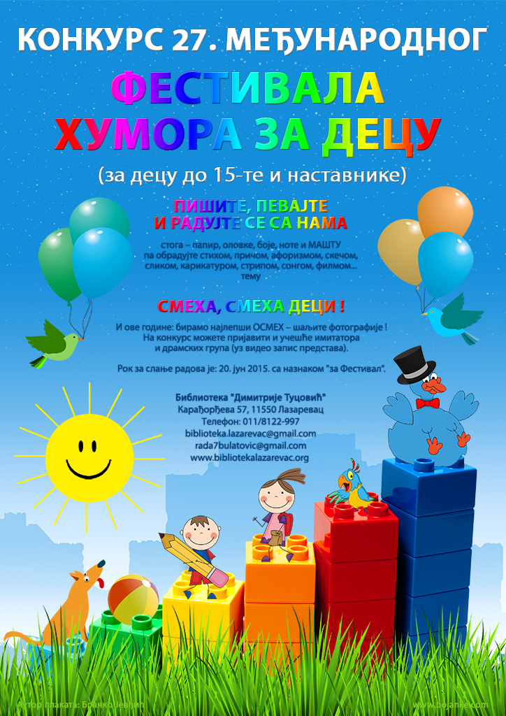 ![]() ПИШИТЕ, СЛИКАЈТЕ, ПЕВАЈТЕ И РАДУЈТЕ СЕ СА НАМА стога – папир, оловке, боје, ноте и МАШТУ па обрадујте стихом, причом, афоризмом, скечом, сликом, карикатуром, стрипом, сонгом, филмом... тему СМЕХА, СМЕХА ДЕЦИ ! И ове године: бирамо најлепши осмех - шаљите фотографије! На конкурс можете пријавити и учешће имитатора и драмских група (уз видео запис представа). Рок за слање радова је : 20. јун 2015. са назнаком "за Фестивал". За литерарне радове можете користити е-пошту, а обавезно у "Subject" упишите великим словима "ЗА 27. ФЕСТИВАЛ ХУМОРА". Преузми: Плакат 27. Фестивала хумора за децу |